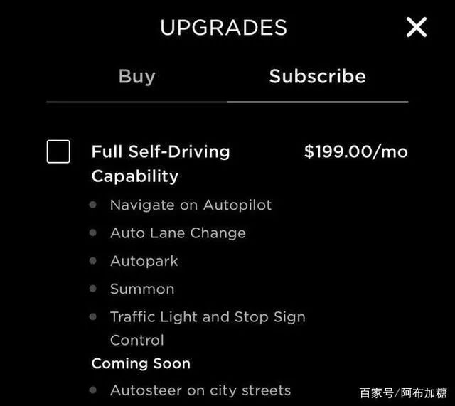 特斯拉 FSD 在过去一直是直接「买断」模式——完全自动驾驶功能6.47万人民币,增强版自动辅助驾驶功能 3.2 万人民币。但从2021年开始,也推出了订阅服务。按月计费,随时可以取消,已购买EAP的月收费99美元(约641人民币),而只是基础版AP的话则需每月支付199美元(约1289人民币),方可享受FSD功能。