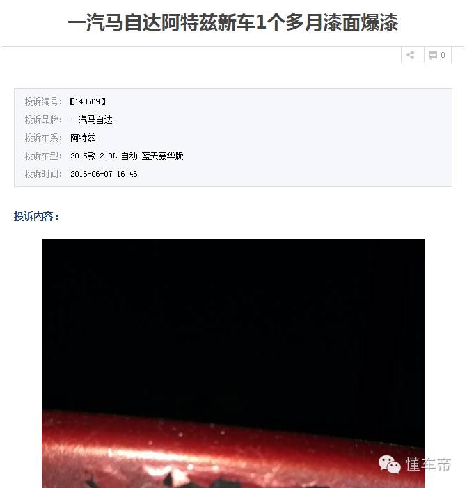 笔者在车质网看到一汽马自达阿特兹关于爆漆、水箱泄露的投诉案例众多,很多车主投诉称自己的车还在新车期间就出现爆漆问题,甚至怀疑4S店销售补过漆的翻新车。查看了汽车投诉网和中国汽车消费网的相关投诉,以及汽车之家论坛质量反馈区,发现也有不少关于这两方面的投诉。