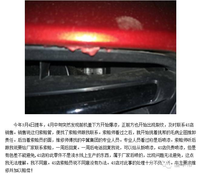 在车质网上,这位车主投诉称,自己的车是今年才提的,还没一个月就发现前机盖下方开始爆漆,正前方也有明显的裂纹。自己找了专业人员看过称是后喷漆。4S店以及厂家都不给予处理。车主要求给予解释以及赔偿。