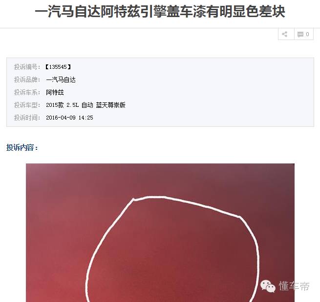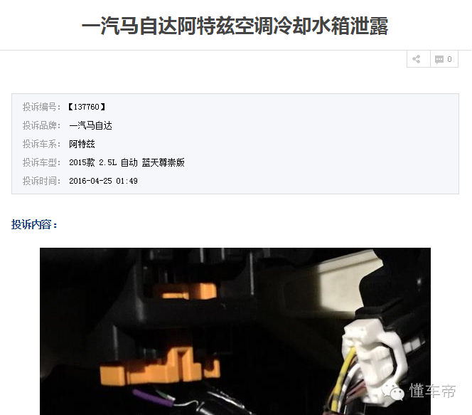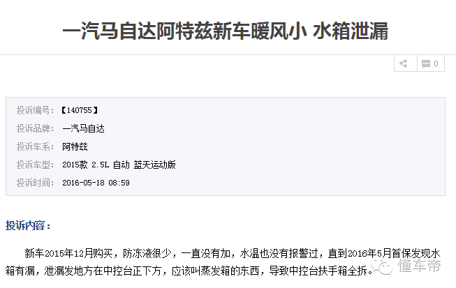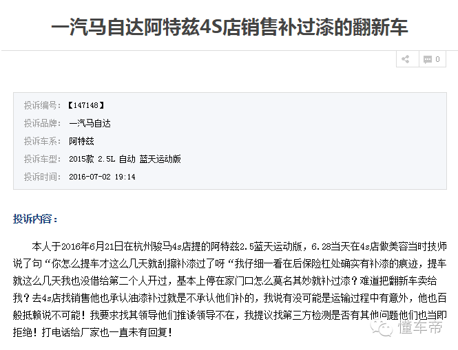 图为中国汽车消费网阿特兹投诉截图