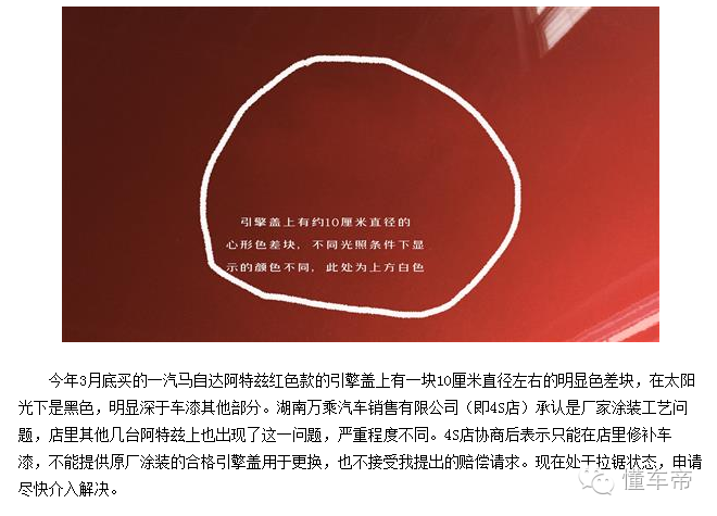 车主投诉称自己的车刚买不久,便发现在引擎盖的地方存在色差块,好好的新车怎么就会出现这样的问题,4S店也表示最多给予补漆,无法提供原厂涂装。这让车主感到很无力。