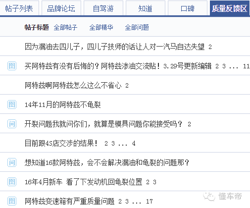 图为汽车之家阿特兹论坛质量反馈区投诉截图