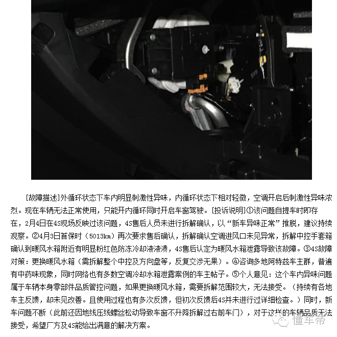 车主投诉称自己的车在4S店售后认定为暖风水箱泄露导致车内异味,需要拆解水箱。并表示类似的问题,在阿特兹其他车友的车子也有出现,希望厂家及4S店能给予满意的解决方案。而不是每次都让车主自己默默买单。
