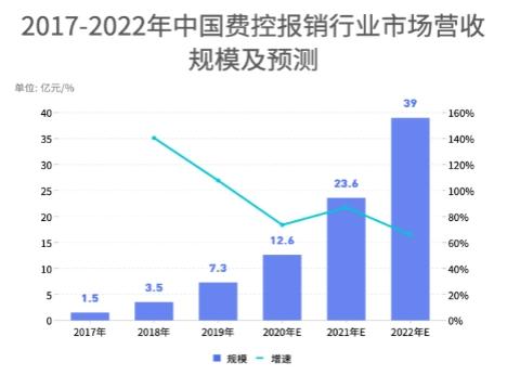 艾瑞咨询数据显示,2019年中国费控行业的市场规模大约在7.3亿元,相较2018年增长100%以上,且将在三年内保持高于60%的高速增长。预计2022年市场规模将达到39亿元,年复合增长率(CAGR)75.2%。相较于全球,中国企业支出管理软件起步晚,渗透率不足1%,未来发展空间巨大。