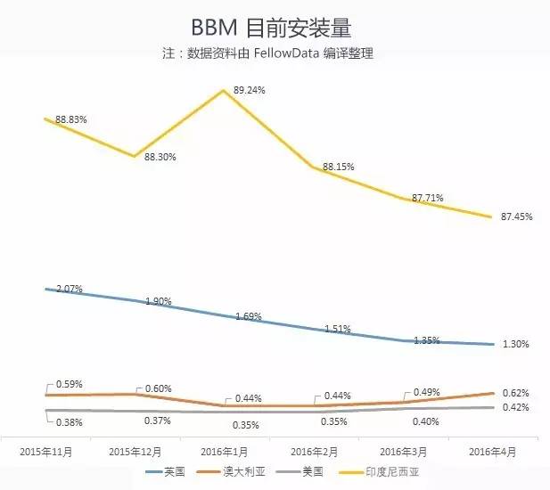 事实上,当你将印度尼西亚的 BBM 安装率与其他国家进行比较时,巨大的差距一目了然。在美国,只有 0.42% 的安卓设备安装了 BBM 应用,澳大利亚和英国安卓设备安装该应用的比例稍高一些。