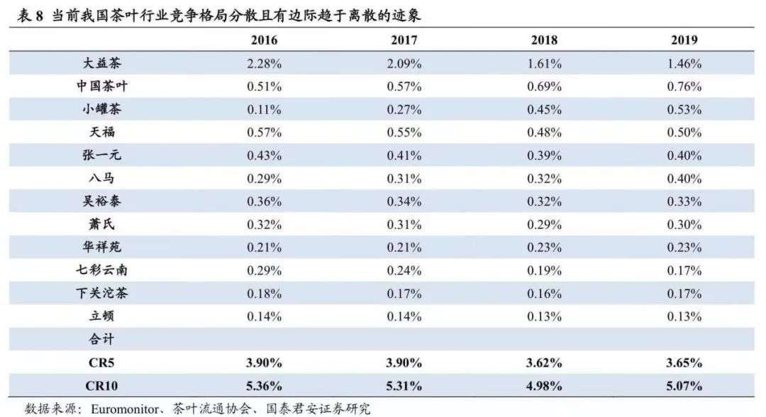 值得一提的是,消费者对高端茶叶的需求日渐增长,但上游的供给却从未跟上。以普洱为例,根据中国普洱茶网的数据,2015年我国普洱茶产量为12.8万吨,其中品质较高的老班章普洱茶产量70吨左右,在总产量中的占比仅为 0.05%。反观白酒,当年茅台基酒产量在酱香型白酒总产量中占比8%。