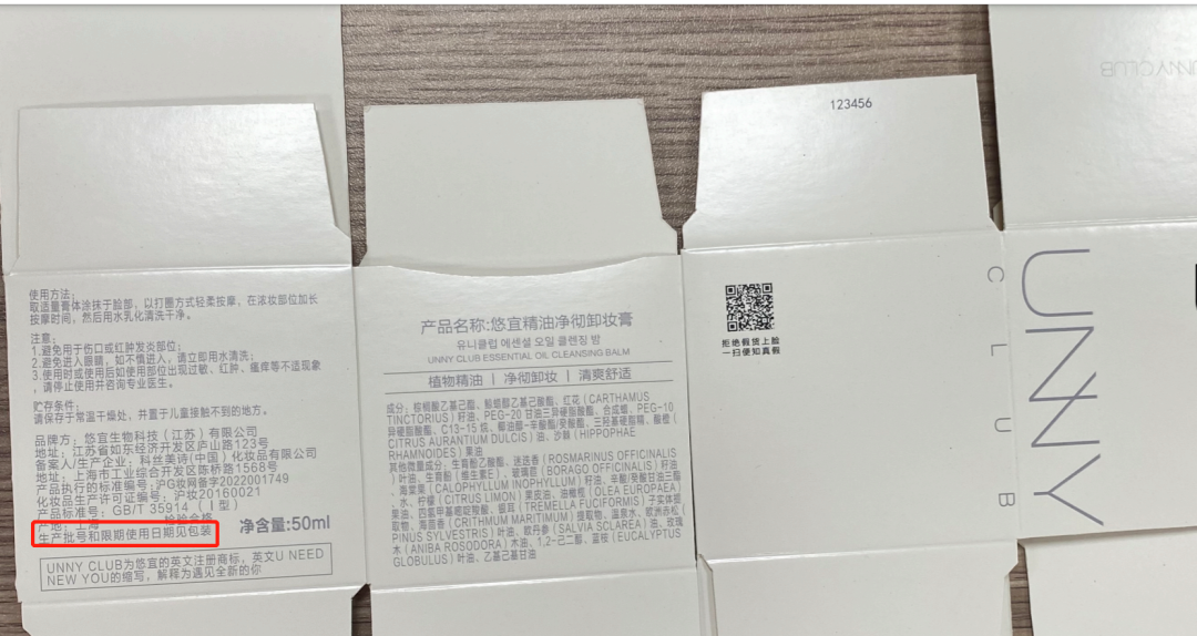 化妆品观察查询国家药监局备案系统发现,不少头部企业都选择了第2种方式。以科丝美诗(中国)化妆品有限公司5月11日备案的“悠宜精油净肤卸妆膏”产品为例,其包装平面图上,即标注有“生产批号和限期使用日期见包装”的引导语。