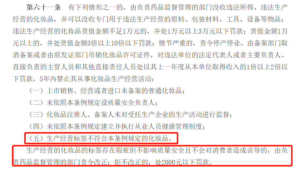 对于前者,按照《化妆品监督管理条例》(下称新条例),轻则处以1万以上罚款,重则停产停业、吊销化妆品许可证件,法定代表人或主要负责人还面临禁业5年的严惩;而对于后者,即属于《办法》第二十条“使用期限、净含量的标注方式和格式不规范等的”“未按照本办法规定使用引导语的”,则依照新条例,归属为标签瑕疵问题,由药监责令整改,拒不改正的,处2000元以下罚款。
