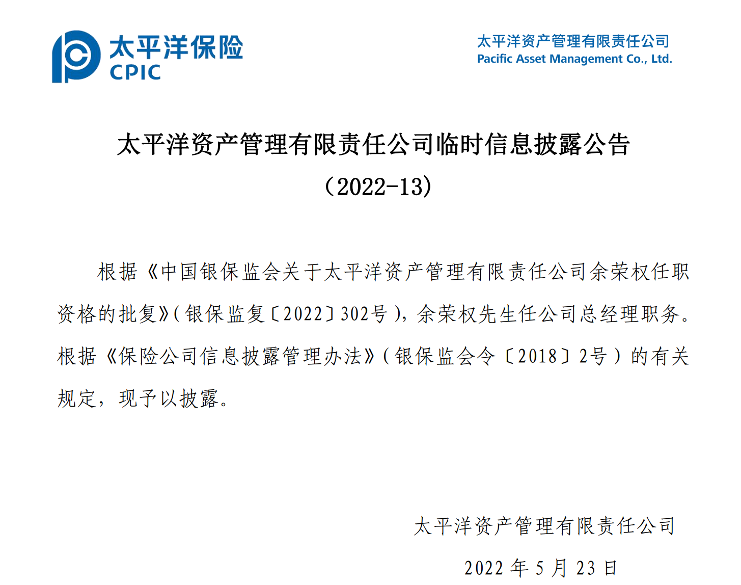 5月23日,太保资产发布公告,根据《中国银保监会关于太平洋资产管理有限责任公司余荣权任职资格的批复》(银保监复〔2022〕302号),余荣权先生任公司总经理职务。