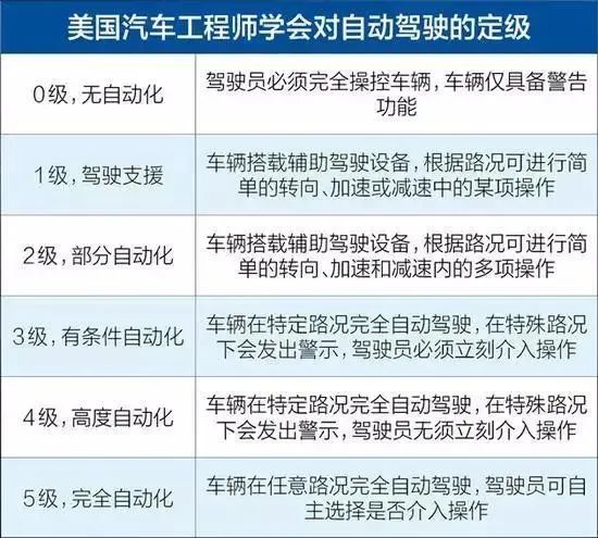 美国汽车工程师学会(SAE)的定义,无人驾驶可以分为六个等级,即:非自动化、L1辅助驾驶、L2半自动化,L3 的有条件自动化,L4 高度自动化,直到 L5 的完全自动化。