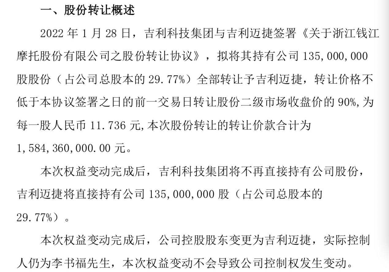 此前的1月28日,钱江摩托控股股东吉利科技集团有限公司(简称“吉利科技”)与吉利迈捷签署《股份转让协议》,吉利科技将向吉利迈捷转让其所持公司135,000,000股股份(占总股本的 29.77%)。每股转让价为11.736元,转让价款合计为15.84亿元。