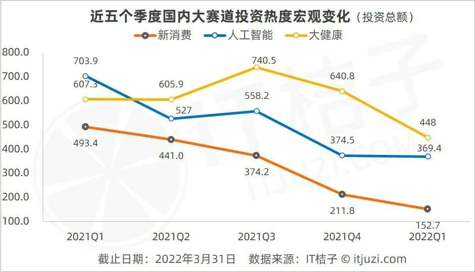 此外,天图投资重点关注的消费市场近期遇冷。据IT桔子统计,近五个季度以来,国内的新消费、人工智能、大健康三个大赛道中,只有新消费的投资金额处于持续下降的态势;并且在今年一季度,大健康领域融资总额为448 亿元,同比减少了 26%;人工智能领域融资总额为369.4 亿元,同比仅下降1%;新消费融资总额为152.7亿元,同比减少了69%,是降幅最大的领域。