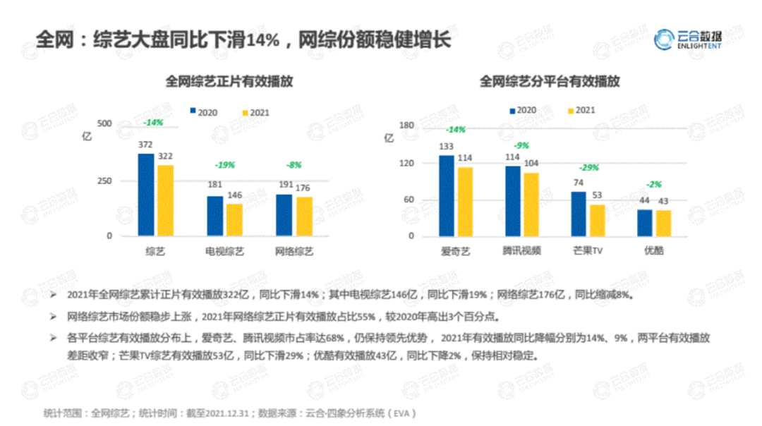 内容端,2021年的芒果TV“弱剧集”没有实质变化,“强综艺”的招牌却有所松动:云合数据显示,2021年全网网络综艺有效播放霸屏榜中芒果TV没有进入前五,在前二十中也仅占四席,而同年芒果TV独播综艺上新量高达52部,仅次于腾讯视频的54部,比爱奇艺和优酷都要多。在全网综艺正片有效播放下降14%的情况下,芒果TV有效播放下降了29%,远远高于行业平均。