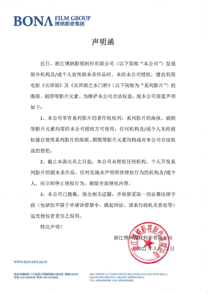 5月24日消息,博纳影业发布维权声明称,公司发现部分机构及/或个人宣传剧本杀作品时,未经公司授权,擅自利用电影《长津湖》及《长津湖之水门桥》(以下统称为“系列影片”)的海报、剧照等影片元素。公司已搜集、保全相关证据,并保留采取一切必要法律手段(包括但不限于申请诉前禁令、提起诉讼、请求行政机关查处等)追究侵权者责任之权利。