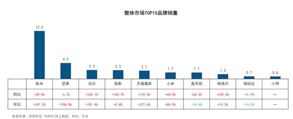 在国内,低价的LCD投影仪同样在抢占中等价位的DLP投影仪的市场。洛图科技(RUNTO)数据显示,去年1-6月,投影累计销量达到172.3万台,从TOP10品牌销量上看,以极米、坚果为代表的头部品牌虽然依旧销量坚挺,可当贝、微影、瑞格尔、天猫魔屏等主打LCD投影仪的品牌同比增长迅猛。