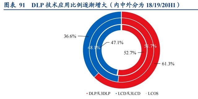 由图可看,从2018年至2020年H1,DLP技术应用比例逐渐增加,3LCD/LCD技术应用比例逐渐减小,而LCOS技术尚未成熟,不足轻重。