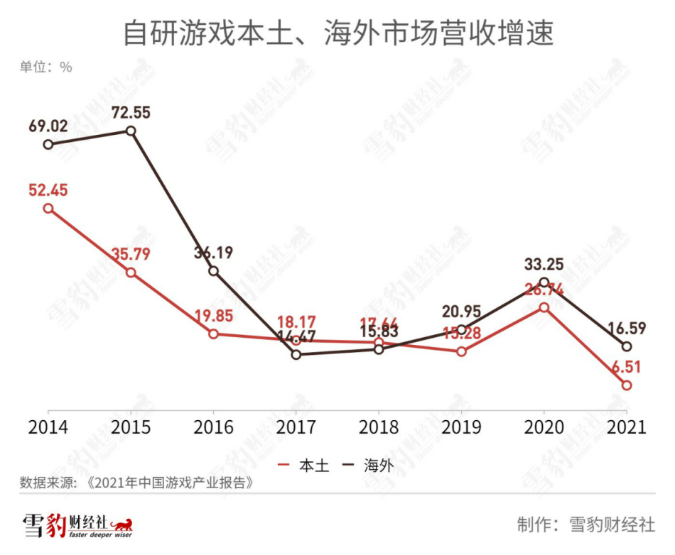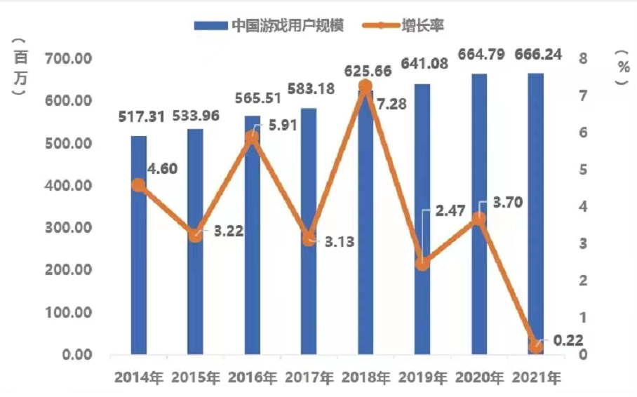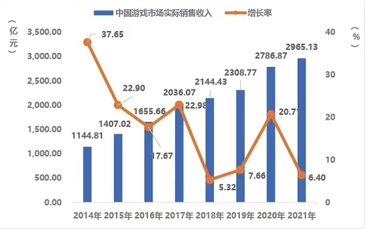 中国游戏市场经过高速发展后,已不可避免地触及增长天花板。据《2021年中国游戏产业报告》,去年中国游戏市场的实际销售收入为2965.13亿元,同比仅增长6.4%;游戏用户规模为6.66亿人,同比增长0.22%。