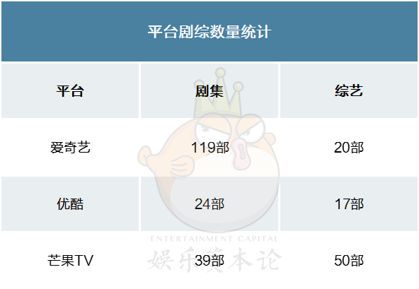 其中,爱奇艺的剧综总量最多,同时在剧集方面显示出较为明显的优势。在共计172部剧集中占比将近70%,且以自制剧为主,其次是芒果TV、优酷。综艺方面势头更猛的是芒果TV,其片单上的综艺多达50档,爱奇艺和优酷的数量接近,分别为20档和17档。
