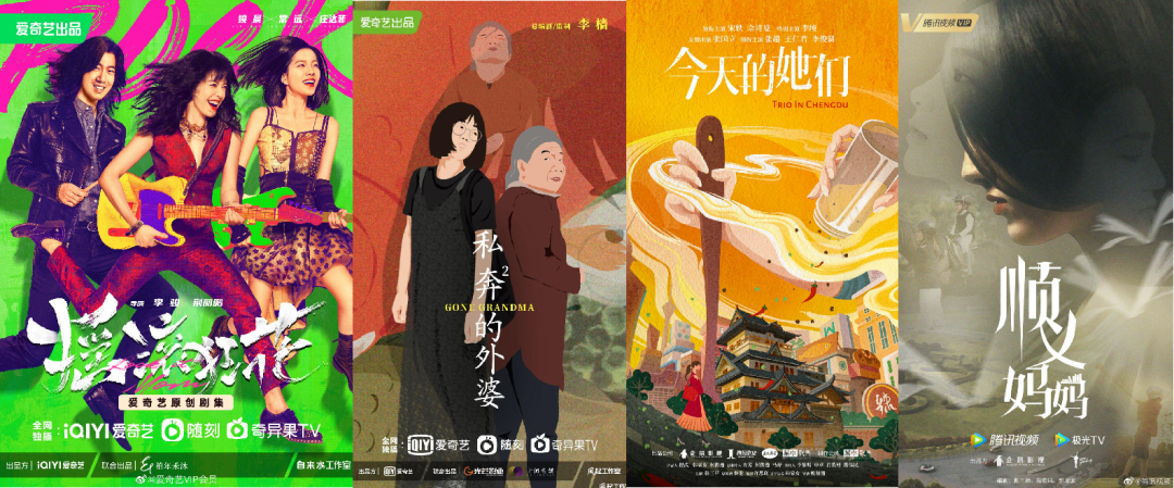 在这方面,各平台剧集也都有充足的项目储备,尤其是爱奇艺,此次公布了14部女性题材剧集。其中,《熟年》将展现熟龄女性面临的内外危机,《第二次拥抱》中有四位处于婚姻和职场困境的年轻妈妈,《家变》聚焦由母女四人组成的单亲家庭,《摇滚狂花》和《私奔的外婆》都通过公路旅行的形式呈现代际碰撞。再看腾讯视频,《今天的她们》的主角是三位在成都经营餐馆的女性,《顺义妈妈》则聚焦居住在北京城郊顺义的妈妈们。