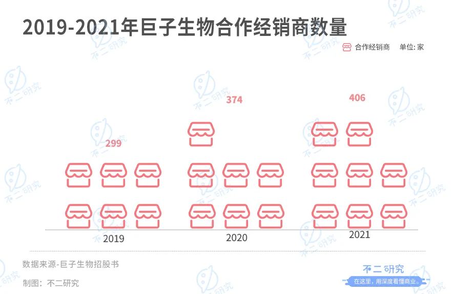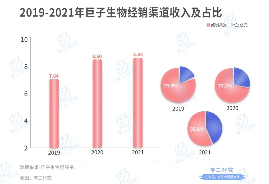 「不二研究」发现,巨子生物对经销商的依赖程度较高。招股书显示,2019-2021年,经销渠道的收入分别为7.64亿、8.60亿和8.63亿元,占总收入比重分别为79.9%、72.2%和 55.6%。尽管2021年占比有所下降,但仍是巨子生物收入的第一大来源。