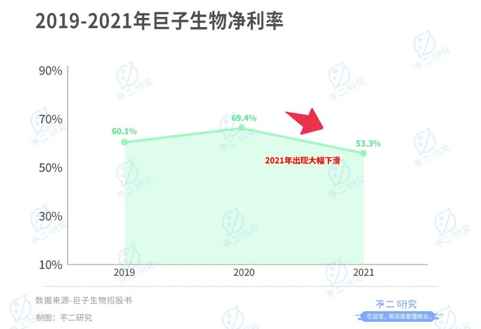 经营数据看似亮眼,但「不二研究」发现,巨子生物的业绩中仍存在不稳定因素——净利率回落。招股书显示,2019-2021年巨子生物净利率分别为60.1%、69.4%和53.3%,2021年出现大幅下滑。