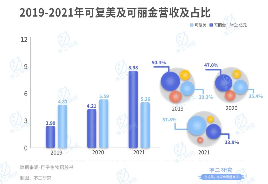 可复美和可丽金是巨子生物的两张“王牌”。招股书显示,2019-2021年,可复美收入分比为2.90亿、4.21亿和8.98亿元,占总收入比重分别为30.3%、35.4%和57.8%;可丽金收入分别为4.81亿、5.59亿和5.26亿元,占总收入比重分别为50.3%、47.0%和33.9%。