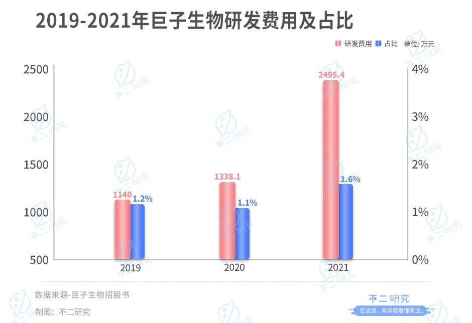 招股书显示,截至2021年12月31日,巨子生物研发团队为84人,占总人数的12.6%。2019-2021年,巨子生物研发费用分别为1140万元、1338.1万元及2495.4万元,在总收入中占比分别为1.2%、1.1%和1.6%。
