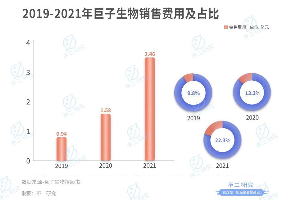 巨子生物在招股书中解释称,净利率的走低归因于线上营销开支的增加。2019-2021年,公司销售费用分别为0.94亿、1.58亿元、3.46亿元,占营业收入比重分别为9.8%、13.3%、22.3%。
