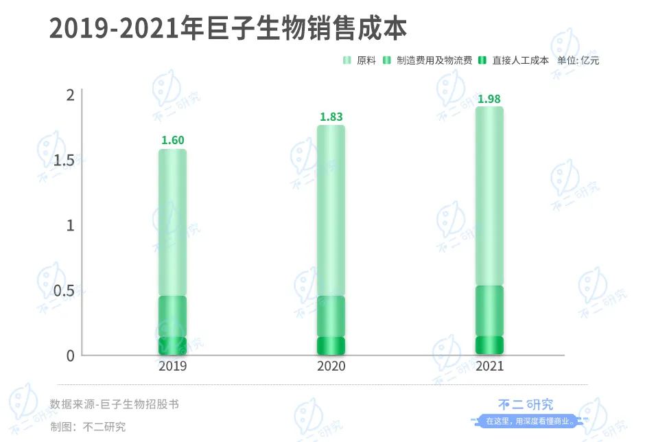 较高的毛利率来自于产业链中的主导权。在胶原蛋白领域,巨子生物覆盖了从原料端到终端产品的全链条,因此具备较强的成本控制能力。招股书显示,2019-2021年,巨子生物销售成本仅分别为1.60亿、1.83亿和1.98亿元,包括原料采购、制造费用及物流等费用。