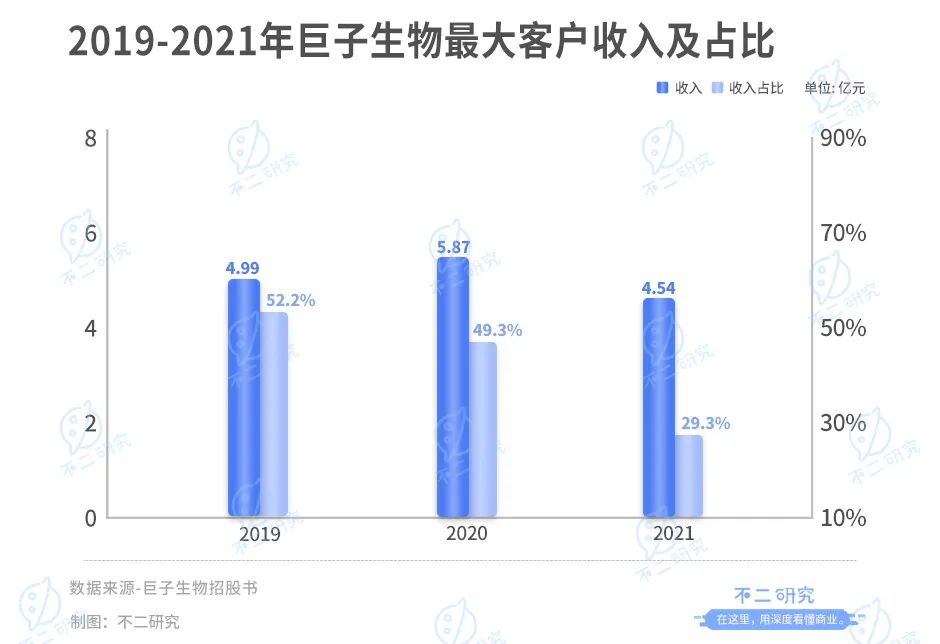 目前,巨子生物还未摆脱对单一大客户的依赖。2019-2021年,来自最大客户西安创客村的收入分别为4.99亿、5.87亿和4.54亿元,占同期总收入的52.2%、49.3%和29.3%。