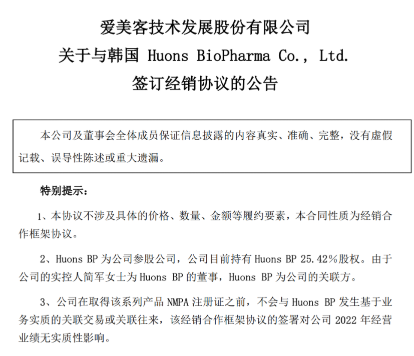 2022年5月23日,爱美客发布公告称,公司日前与韩国Huons BP签订经销合作框架协议,约定公司以研发注册方式引进Huons BP的肉毒素产品,并在约定经销区域内作为后者指定的唯一合法经销商进行产品的进口和经销。