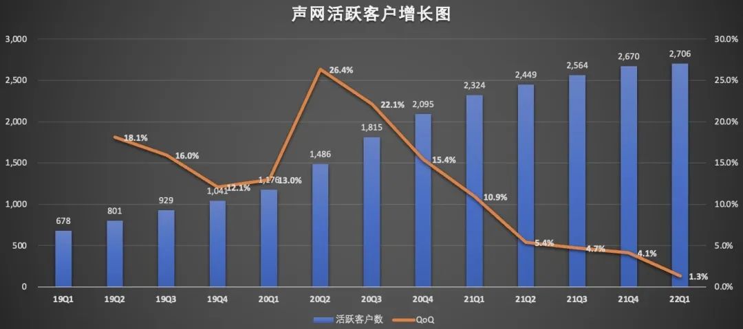数据显示,截至2022年3月底,声网全球注册应用超43.9万,全球活跃客户数量达2706个,上年同期为2095个,同比增长16.4%,较上一季度的2564个,环比增长1.3%。与之前几个季度相比,声网月活用户增速亦呈现持续放缓的趋势。