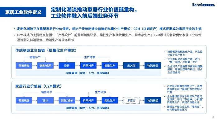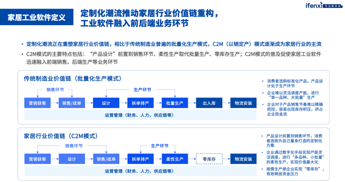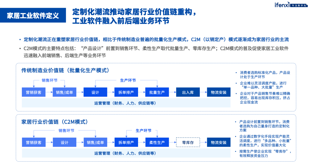 家居行业产业链结构复杂,家居工业软件广泛应用于产业链上中下游各环节。家居行业特有的产品交付模式使其具备较高的可定制化属性,这对家居企业的设计、生产能力及整体业务协调都提出了更高要求。定制化潮流推动家居行业价值链发生重构,C2M(以销定产)模式逐渐成为家居行业的主流。C2M模式的普及促使家居工业软件迅速融入前端销售、后端生产等业务环节,进而助力我国工业软件在家居产业实现突破。