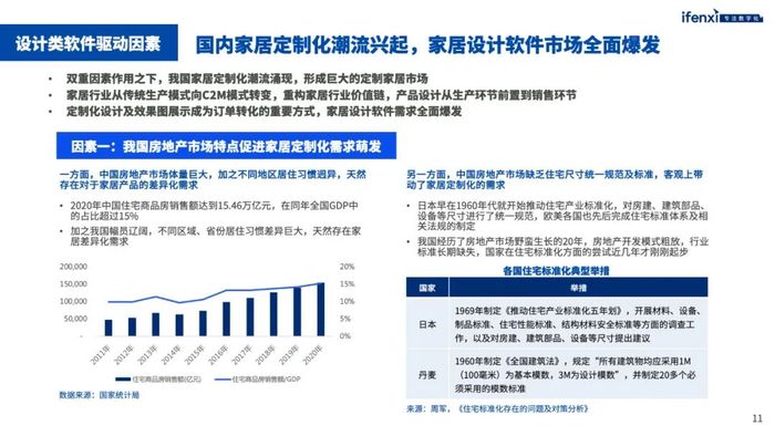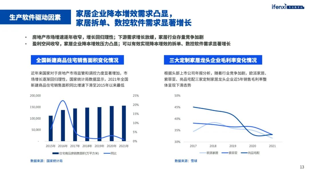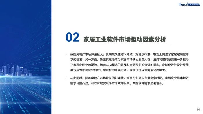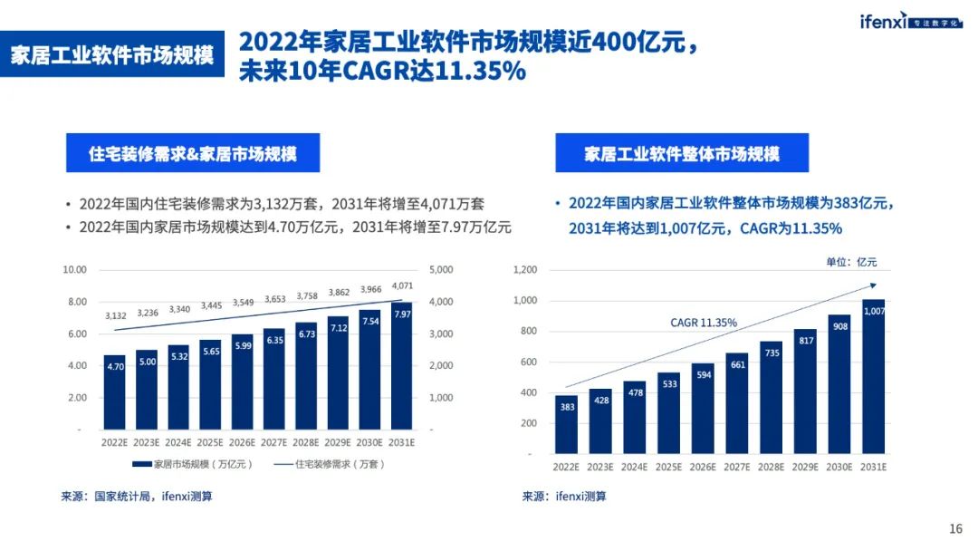 当前,我国工业正在经历新旧动能加速转换的关键阶段,工业数字化转型步伐日益加快。工业软件是现代工业的灵魂,已经渗透和广泛应用于几乎所有工业领域的核心环节,其中,家居行业是工业软件最主要的应用领域之一。据统计,2022年国内家居市场规模达到4.7万亿元。过去20年,伴随着高速的城市化进程,我国房地产市场进入了野蛮生长时期,同时孕育了巨大的家居市场,在此期间,居民价值观、消费观也发生了的重大变化,家居工业软件因此具备广阔的市场发展空间。