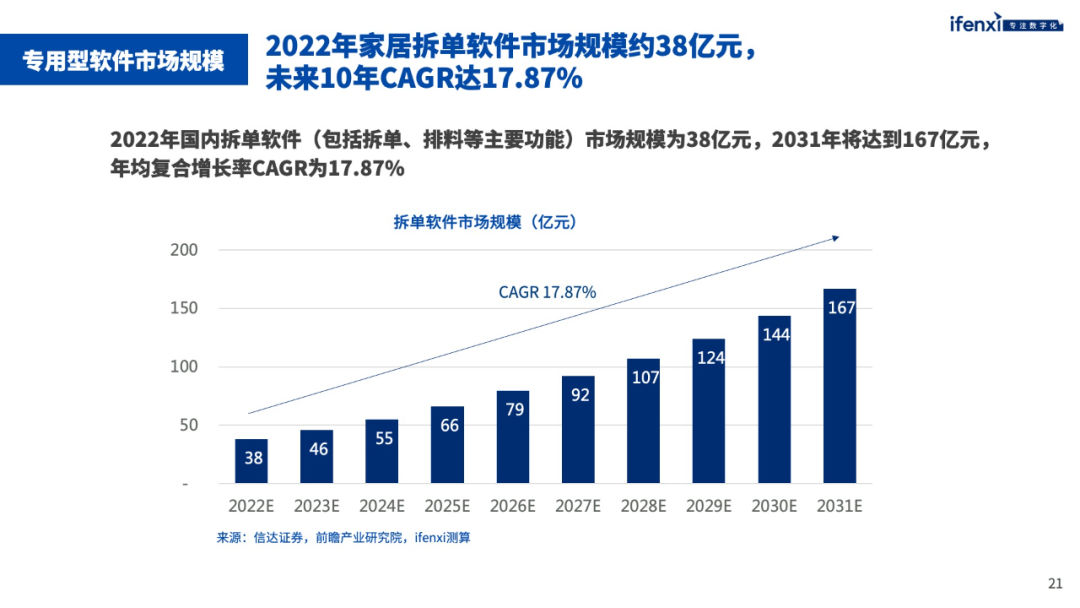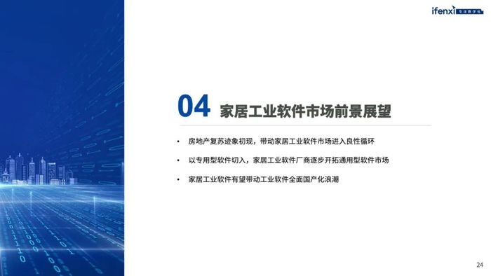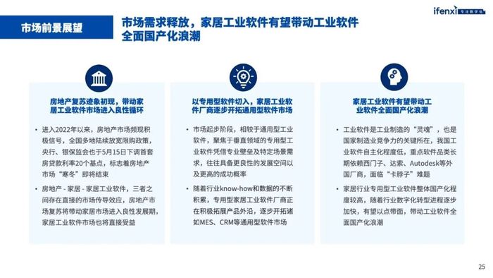 近年来,随着国家对工业软件创新和制造业数字化转型的重视、新技术的不断涌现,传统家居制造行业也按下了数字化转型加速键,本土家居工业软件企业正在崛起,致力于突破以往家居工业软件只服务单一环节这一“顽疾”,打通从设计到生产全链条的数据壁垒,以解决家居行业的难点、痛点。同时,由于家居行业专用型工业软件整体国产化程度较高,随着行业数字化转型进程逐步加快,有望以点带面,带动工业软件全面国产化浪潮。