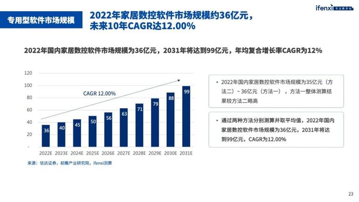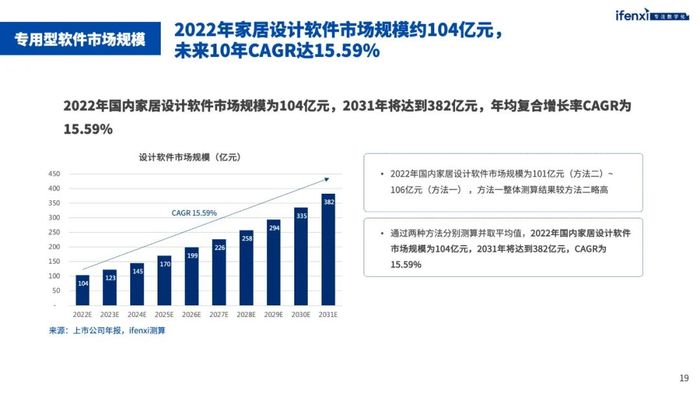 另一方面,房地产市场增速逐渐回归理性,下游需求增长放缓,家居行业整体存量竞争加剧,家居企业降本增效需求凸显,对于家居工业软件的迫切需求正在加速释放。2022年以来,房地产复苏迹象初现,房地产 - 家居 - 家居工业软件三者之间存在直接的市场传导效应,房地产市场复苏将带动家居市场进入良性发展期,也为家居工业软件市场带来了新的契机,进入下一个增长阶段。据爱分析测算,2022年国内家居工业软件整体市场规模为383亿元,预计到2031年,国内家居工业软件市场将突破千亿,整体市场规模达到1,007亿元,CAGR为11.35%。