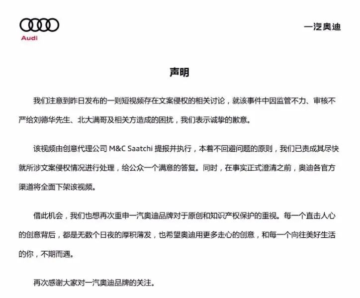 5月21日,一汽奥迪与刘德华合作拍摄的一则名为《人生小满》的短视频广告,迅速走红网络。但就在发布不久后,一位名为“北大满哥”的博主表示,《人生小满》抄袭了他此前发布的视频文案,在给出的详细文案对比中,一汽奥迪的广告文案存在大量雷同,这也被网友称作“像素级抄袭”。