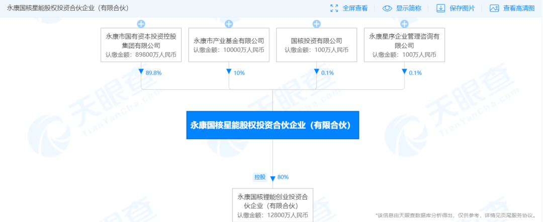 天眼查显示,永康国核星能股权投资合伙企业(有限合伙)于3月25日在浙江省金华市永康市注册成立,该基金由市国投集团、市产业基金有限公司、国核投资有限公司和永康星序企业管理咨询有限公司共同组建,基金管理人为国核投资有限公司。