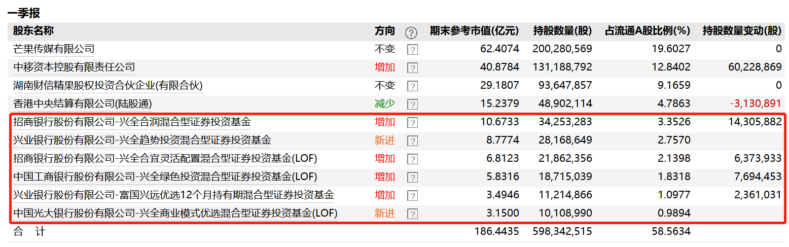 Wind数据显示,截至今年一季度末,芒果超媒前十大流通股东中共有六只公募基金的身影。其中谢治宇管理的兴全合润、兴全趋势、兴全合宜三只基金共计持有8428.54万股,占流通股比例达8.25%。邹欣管理的兴全绿色投资持有1871.5万股;林庆管理的富国兴远优选12个月持有1121.49万股;乔迁管理的兴全商业模式持有1010.9万股。其中,兴全趋势、兴全商业模式均为一季度新进的前十大股东。