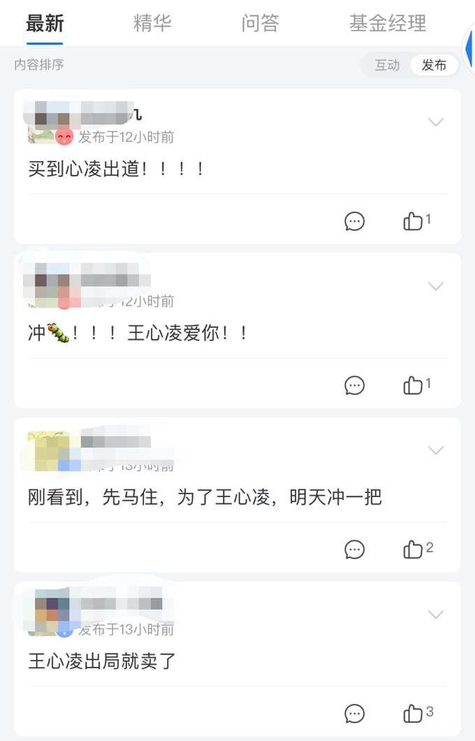 基金投资者也不甘示弱,在蚂蚁财富基金讨论区,许多基民表示要通过买基金的方式支持偶像。在兴全合润的评论区,许多基民表示“为了王心凌冲一把”、“王心凌出局就卖了”。