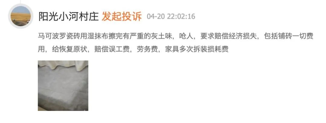 还有网友表示:“马可波罗瓷砖用湿抹布擦完有严重的灰土味,呛人。”