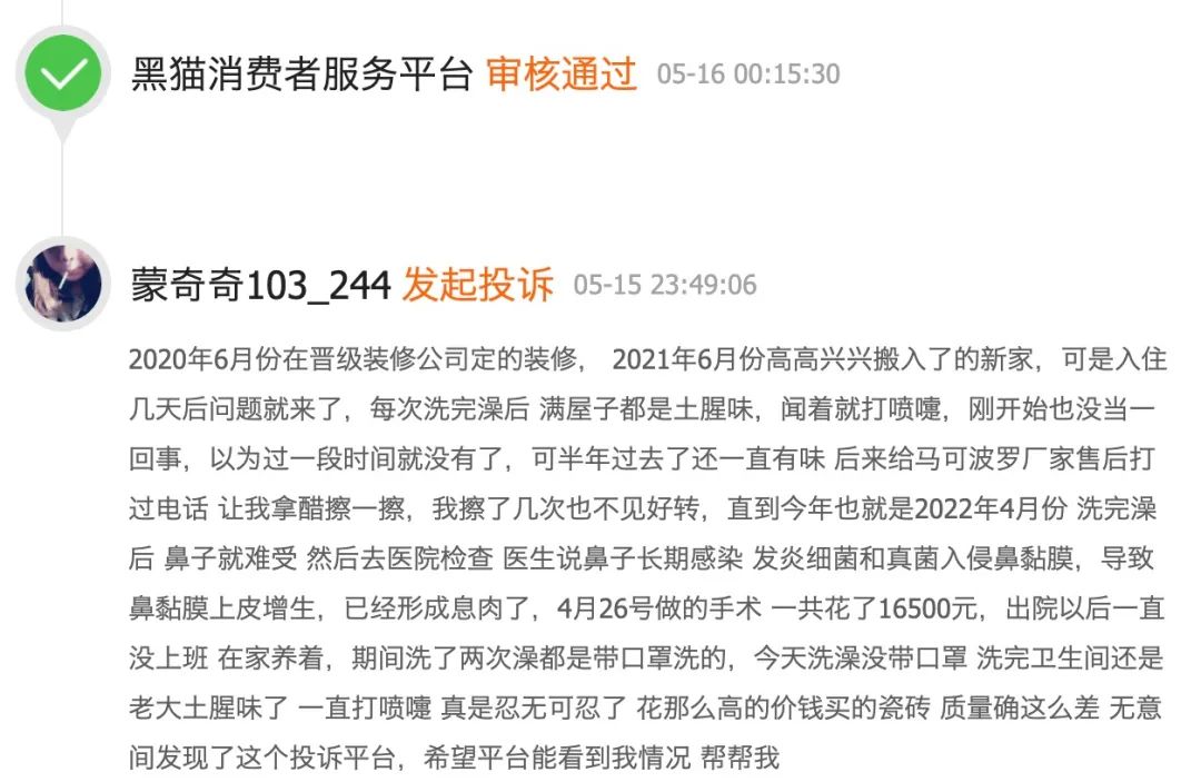 就在马可波罗递交《招股书》的一周前,黑猫投诉网友表示,使用马可波罗的瓷砖装修,“每次洗完澡后满屋子都是土腥味,闻着就打喷嚏”,“ 半年过去了还一直有味,后来给马可波罗厂家售后打过电话,让我拿醋擦一擦,我擦了几次也不见好转,直到今年也就是2022年4月份,洗完澡后鼻子就难受,然后去医院检查,医生说鼻子长期感染,发炎细菌和真菌入侵鼻黏膜,导致鼻黏膜上皮增生,已经形成息肉了。”