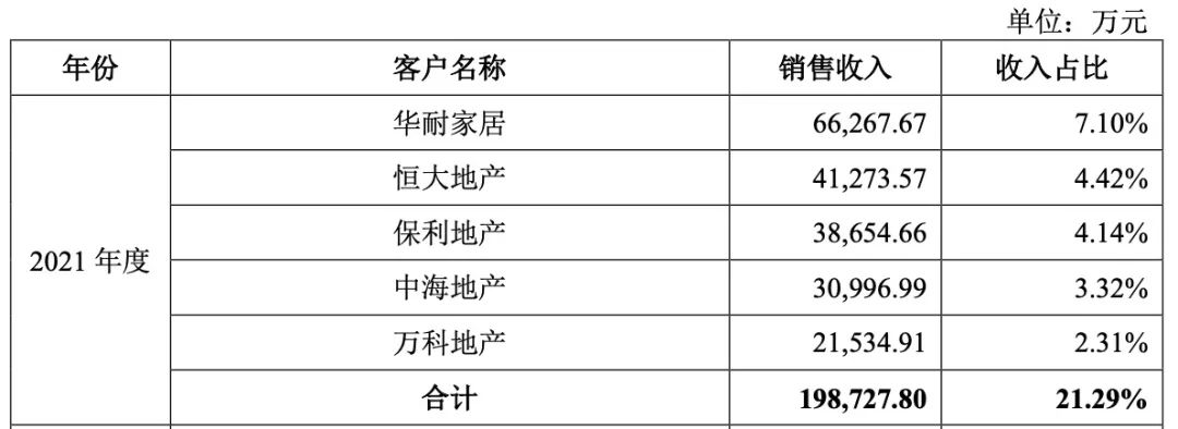 《招股书》显示,2021年,马可波罗前五客户分别为华耐家居、恒大地产、保利地产、中海地产、万科地产,合计销售收入19.87亿元,占比21.29%。