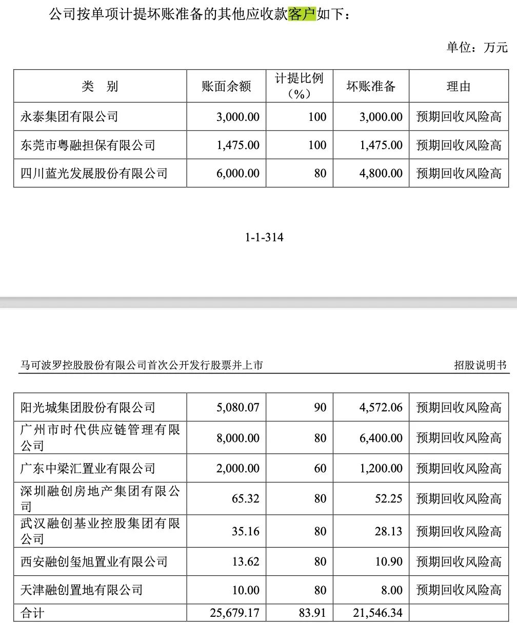 《招股书》显示,马可波罗应收款中,预期回收风险高的坏账准备共计2.15亿元,其中包括不少知名地产公司,如蓝光发展、融创、阳光城等。