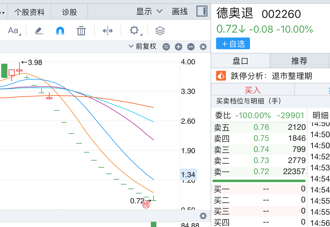 2022年4月21日,深交所上市委员会召开终止上市听证会,会后对公司终止上市事宜进行审议。最终,交易所决定公司股票终止上市。由此,德奥退也自2022年5月5日进入退市整理期,预计最后交易日期为2022年6月16日,如证券交易日期出现调整,公司退市整理期最后交易日期随之顺延。