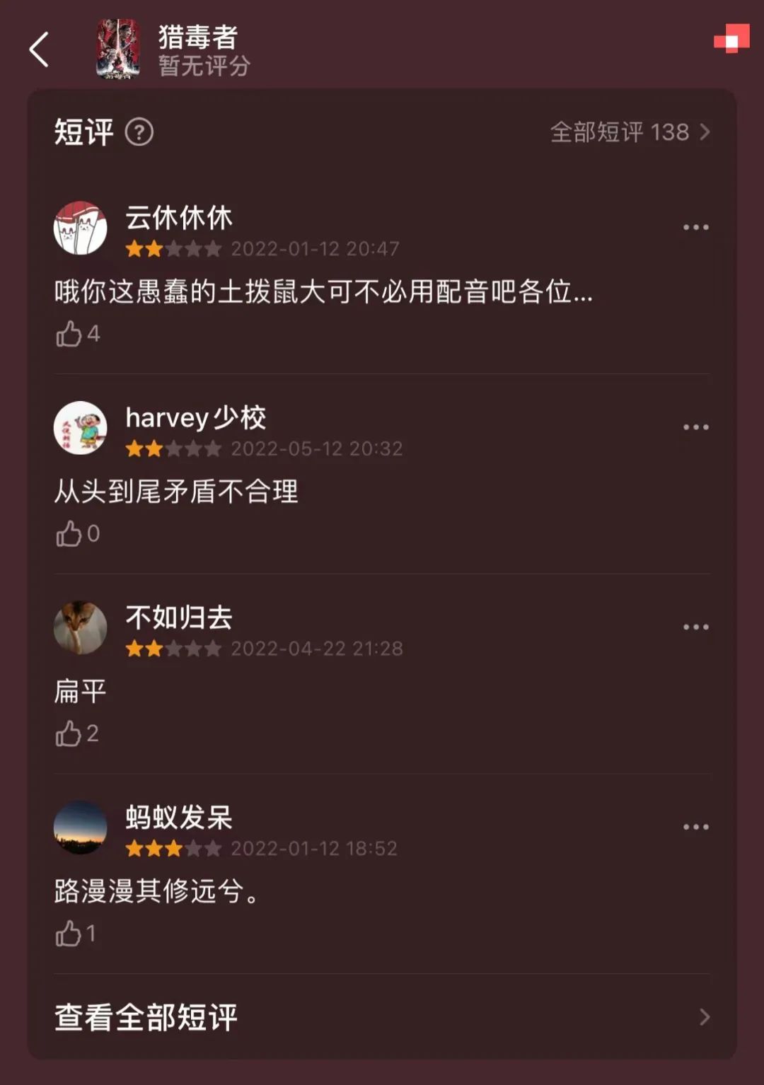 按照市场规律,既无头部出品方,又无头部主创和热门IP护航的犯罪题材电影《猎毒者》,称得上是今年以来唯一一部实现逆袭上榜的“三无项目”。在豆瓣平台上,这部作品至今未能开分,只有138位网友留下了评价,其中大多为低分。相比那些在豆瓣仍获较高关注度的正统头部网络电影,这部影片的高分账表现或许真的只是一次意外收获。