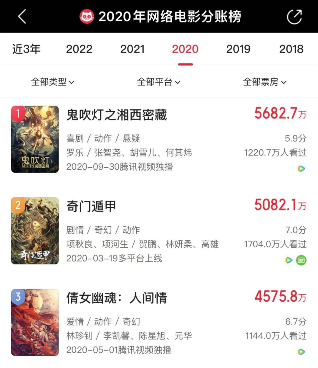 两年前,投资近4000万的《倩女幽魂:人间情》在腾讯视频火爆出圈,斩获4575.8万的票房成绩。从分账角度看这部影片无疑是积极的,但在投资回报比维度来看,这部影片显然还有更大空间。相比之下,声称成本2000万,最终票房5082.1万的《奇门遁甲》,显然更能让投资人开心。