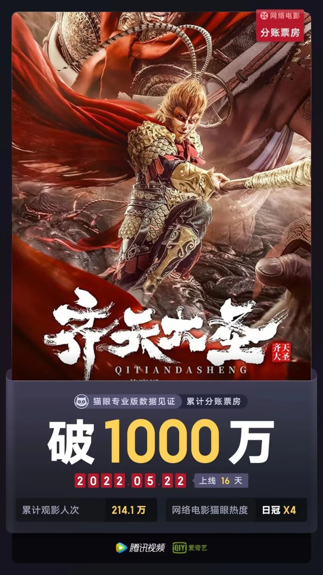 5月23日早些时候,5月7日上线的奇幻网络电影《齐天大圣》宣布分账突破1000万大关。
