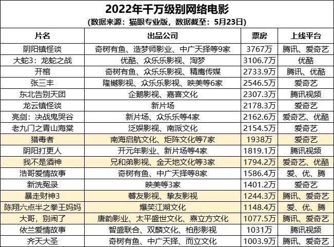在这短短一个月时间里,市场上已经接连涌现了《东北告别天团》《依兰爱情故事》《开棺》《齐天大圣》四部新的千万级别网络电影。其中表现最佳的《开棺》上线不过三周就凭借2711.5万票房跃升至2022全年分账榜的第三位。