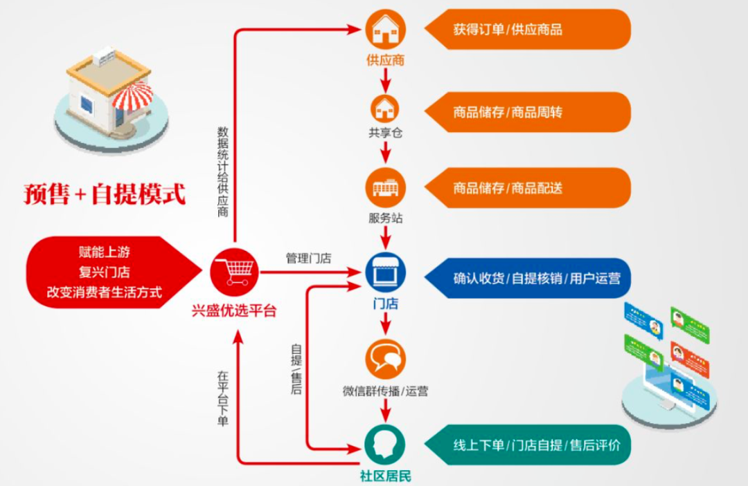 社区团购龙头兴盛优选于2013年在湖南成立,其主打的模式是“预售+次日提”,即先收集好客户的需求,平台汇总后,向供应商下单,配送到相应的自提点。